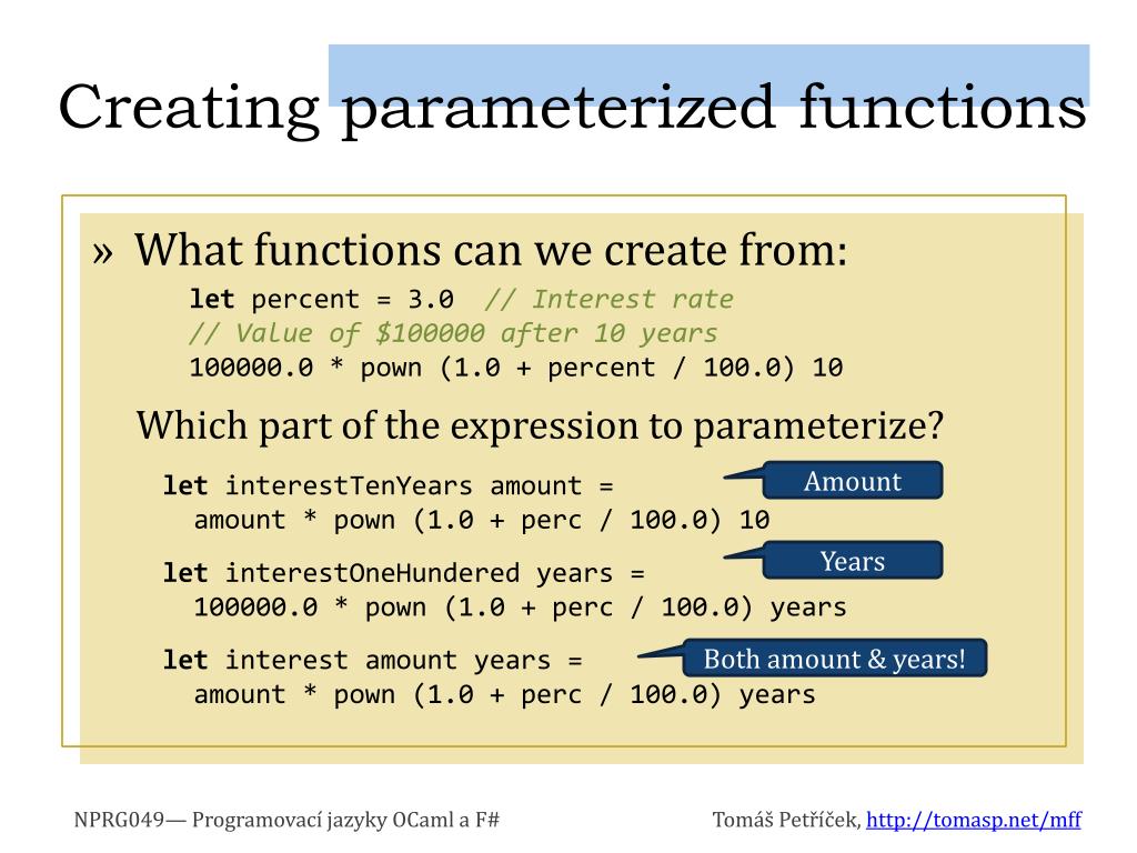 Creating parameterized functions • What functions can we create from: Which part of the expression to parameterize? let percent = 3.0 // Interest rate // Value of $100000 after 10 years 100000.0 * pown (1.0 + percent / 100.0) 10 letinterestTenYears amount = amount * pown (1.0 + perc / 100.0) 10 letinterestOneHundered years = 100000.0 * pown (1.0 + perc / 100.0) years let interest amount years = amount * pown (1.0 + perc / 100.0) years Amount Years Both amount & years!