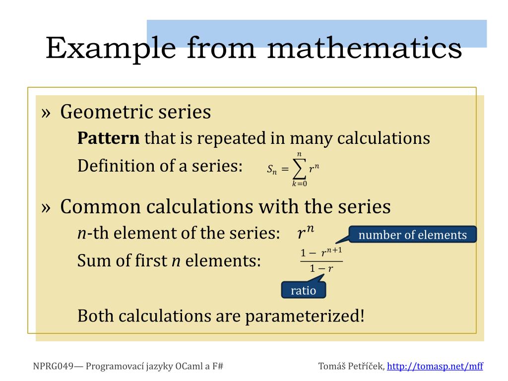 Example from mathematics • Geometric series Pattern that is repeated in many calculations Definition of a series: • Common calculations with the series n-th element of the series: Sum of first n elements: Both calculations are parameterized! number of elements ratio