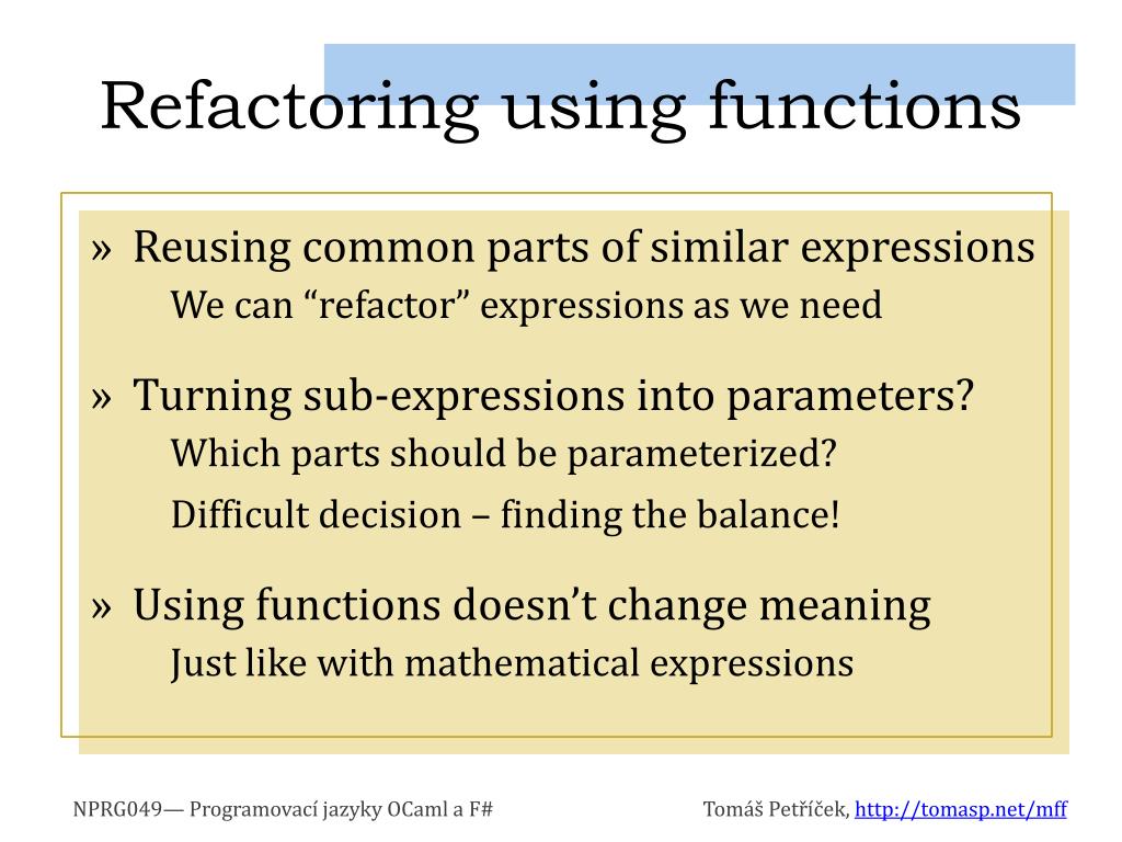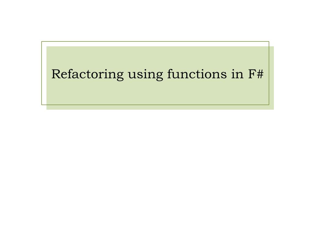 Program o vací jazyky F # a OCaml. Chapter 2. Refactoring code using functions. What is “Refactoring”?. Refactoring is the process of changing a program's internal structure without modifying its existing functionality, in order to improve internal quality attributes of the software.