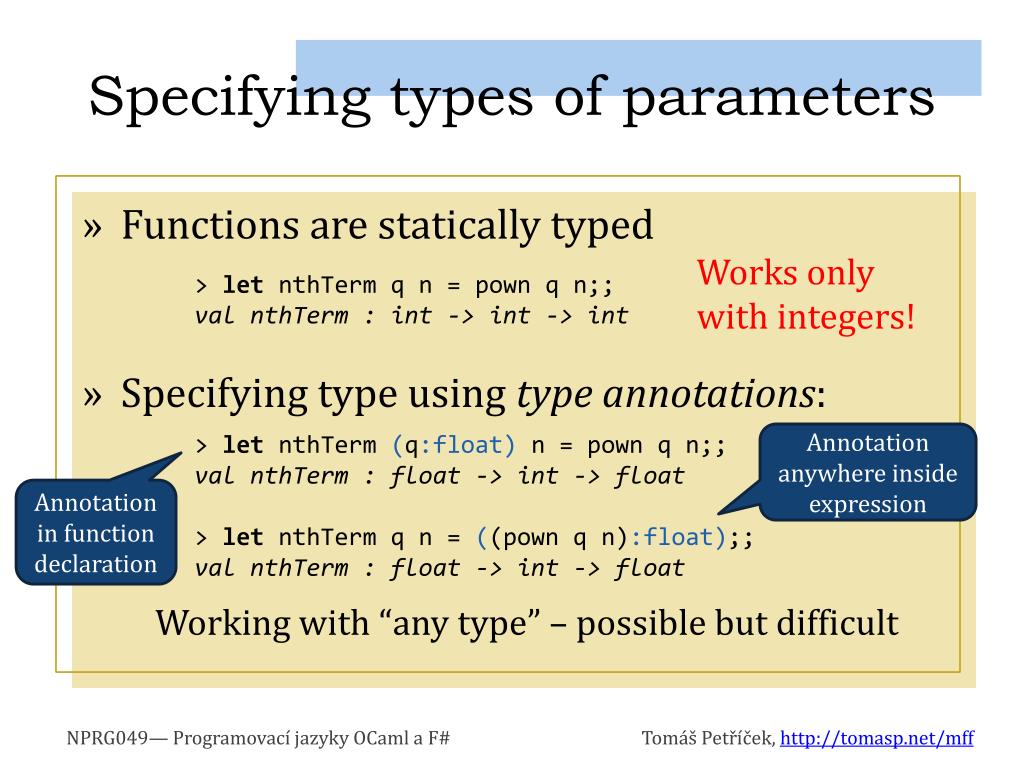 Specifying types of parameters • Functions are statically typed Works only with integers! • Specifying type using type annotations: Working with “any type” – possible but difficult > let nthTerm q n = pown q n;; valnthTerm : int -> int -> int > let nthTerm(q:float) n = pown q n;; valnthTerm : float -> int -> float > let nthTerm q n = ((pown q n):float);; valnthTerm : float -> int -> float Annotationanywhere inside expression Annotationin function declaration