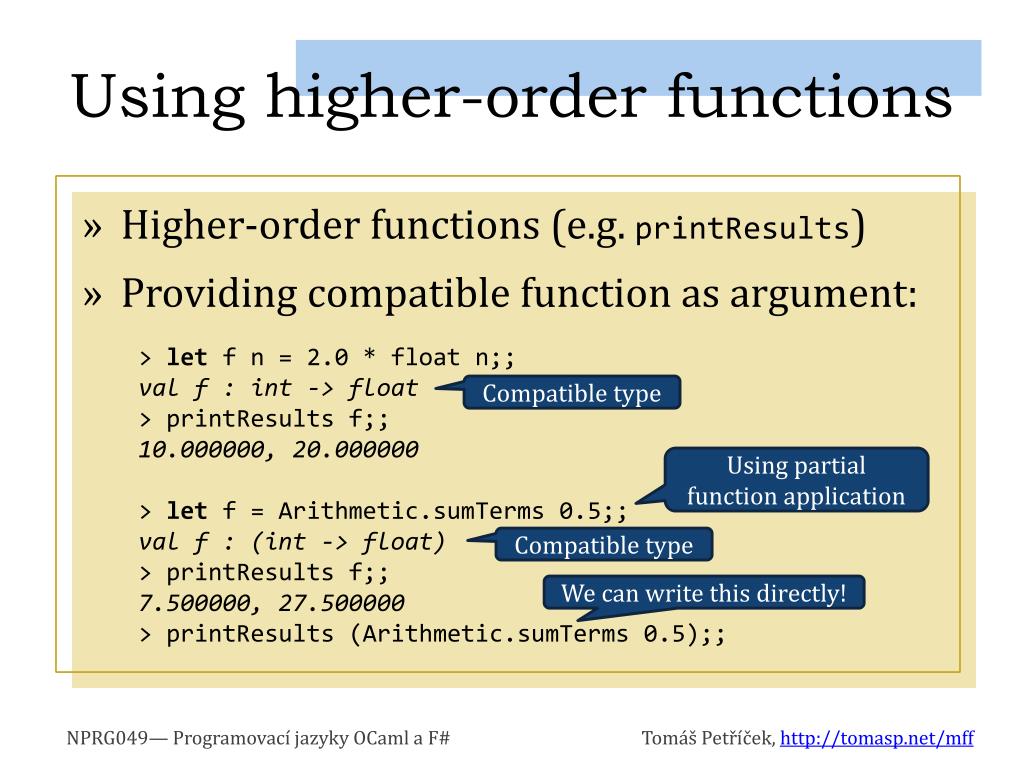 Using higher-order functions • Higher-order functions (e.g. printResults) • Providing compatible function as argument: > let f n = 2.0 * float n;; val f : int -> float > printResults f;; 10.000000, 20.000000 > let f = Arithmetic.sumTerms 0.5;; val f : (int -> float) > printResults f;; 7.500000, 27.500000 > printResults (Arithmetic.sumTerms 0.5);; Compatible type Using partial function application Compatible type We can write this directly!