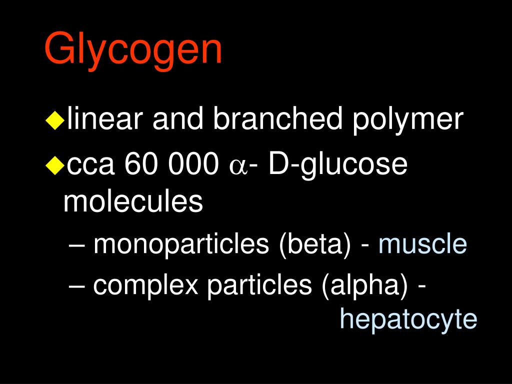 Glycogen • linear and branched polymer • cca 60 000 - D-glucose molecules • monoparticles (beta) - muscle • complex particles (alpha) - hepatocyte