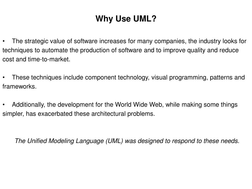 Why Use UML? • The strategic value of software increases for many companies, the industry looks for techniques to automate the production of software and to improve quality and reduce cost and time-to-market. • These techniques include component technology, visual programming, patterns and frameworks. • Additionally, the development for the World Wide Web, while making some things simpler, has exacerbated these architectural problems. The Unified Modeling Language (UML) was designed to respond to these needs.