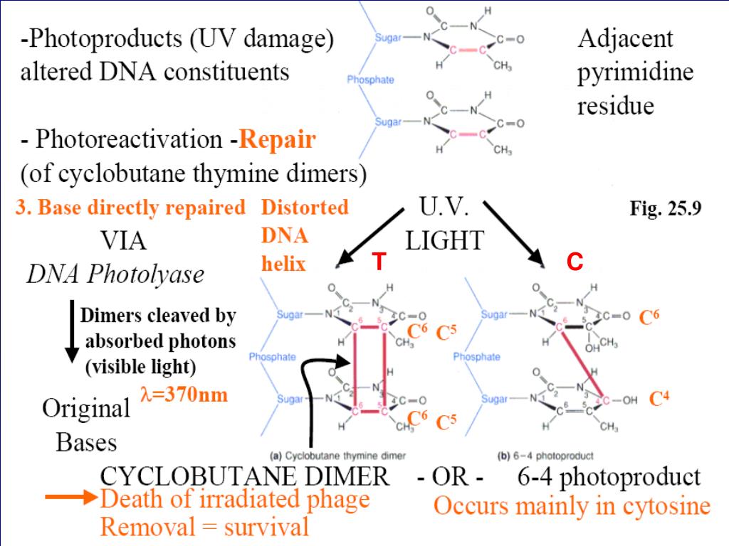 DIRECT DNA DAMAGE AND REPAIR • A variety of irradiation (ionizing, ultraviolet, etc) • DNA damage of a variety of sorts: • U.V. induced formation of Thymine Dimmer • Blocked replication and gene expression until repaired • Prohotoreactivation enzyme • Photolyase • Prokaryote