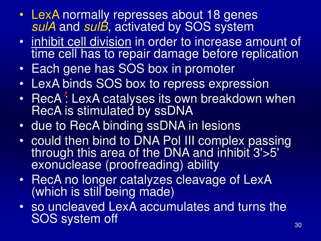 LexA normally represses about 18 genes sulA and sulB, activated by SOS system • inhibit cell division in order to increase amount of time cell has to repair damage before replication • Each gene has SOS box in promoter • LexA binds SOS box to repress expression • RecA : LexA catalyses its own breakdown when RecA is stimulated by ssDNA • due to RecA binding ssDNA in lesions • could then bind to DNA Pol III complex passing through this area of the DNA and inhibit 3'>5' exonuclease (proofreading) ability • RecA no longer catalyzes cleavage of LexA (which is still being made) • so uncleaved LexA accumulates and turns the SOS system off