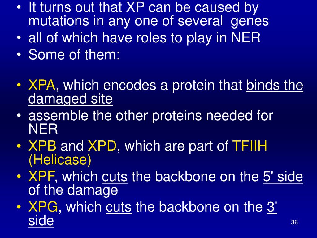 It turns out that XP can be caused by mutations in any one of several genes • all of which have roles to play in NER • Some of them: • XPA, which encodes a protein that binds the damaged site • assemble the other proteins needed for NER • XPB and XPD, which are part of TFIIH (Helicase) • XPF, which cuts the backbone on the 5' side of the damage • XPG, which cuts the backbone on the 3' side