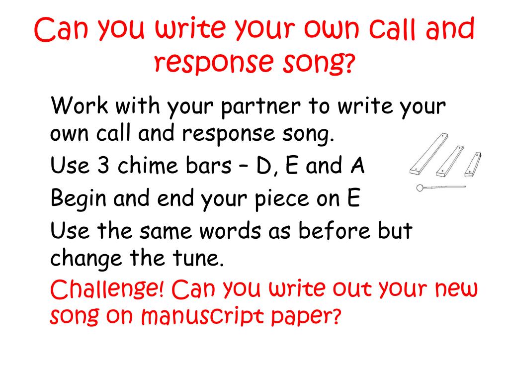 Can you write your own call and response song? Work with your partner to write your own call and response song. Use 3 chime bars – D, E and A Begin and end your piece on E Use the same words as before but change the tune. Challenge! Can you write out your new song on manuscript paper?