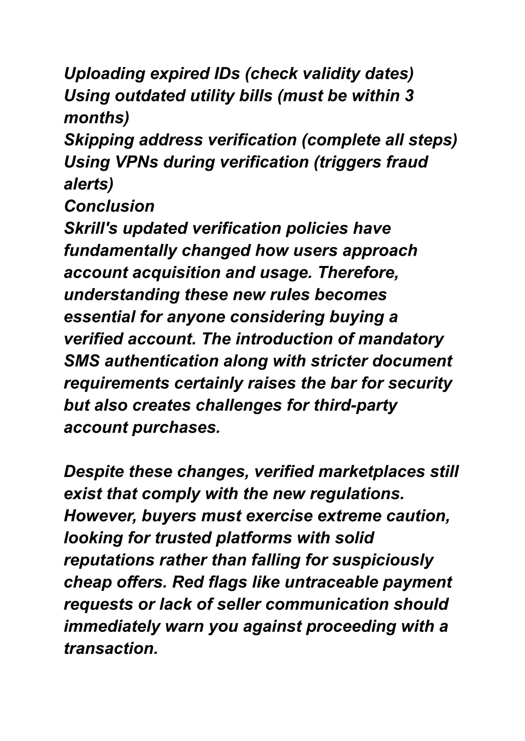 12. Uploading expired IDs (check validity dates) Using outdated utility bills (must be within 3 months) Skipping address verification (complete all steps) Using VPNs during verification (triggers fraud alerts) Conclusion Skrill's updated verification policies have fundamentally changed how users approach account acquisition and usage. Therefore, understanding these new rules becomes essential for anyone considering buying a verified account. The introduction of mandatory SMS authentication along with stricter document requirements certainly raises the bar for security but also creates challenges for third-party account purchases. Despite these changes, verified marketplaces still exist that comply with the new regulations. However, buyers must exercise extreme caution, looking for trusted platforms with solid reputations rather than falling for suspiciously cheap offers. Red flags like untraceable payment requests or lack of seller communication should immediately warn you against proceeding with a transaction.