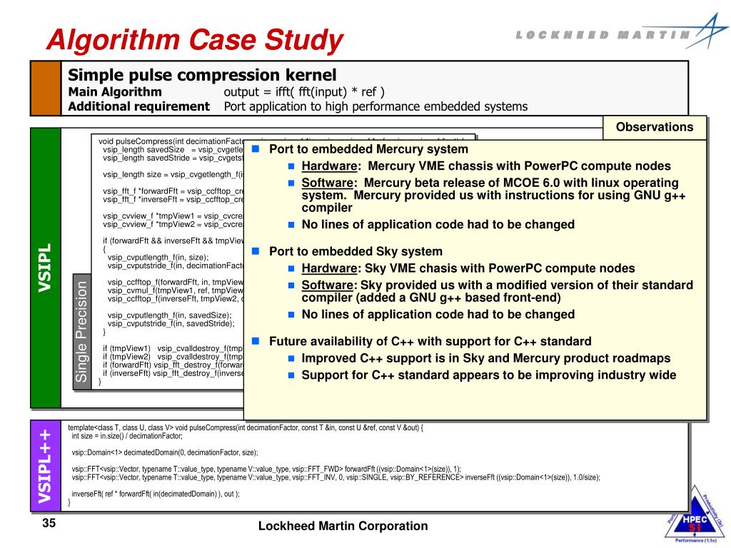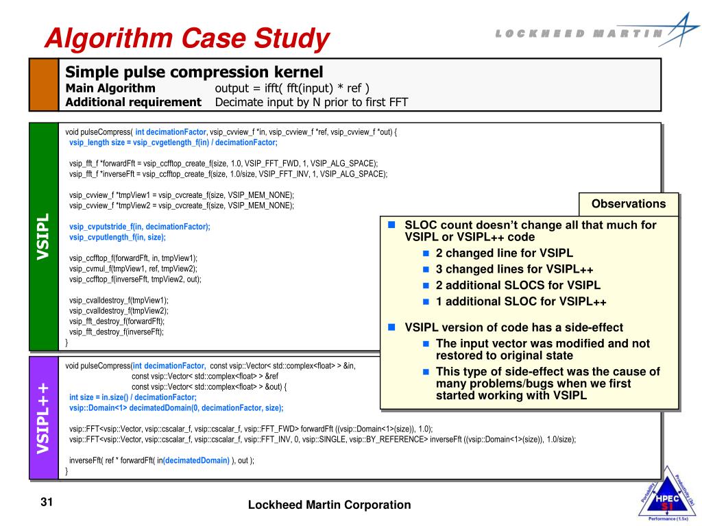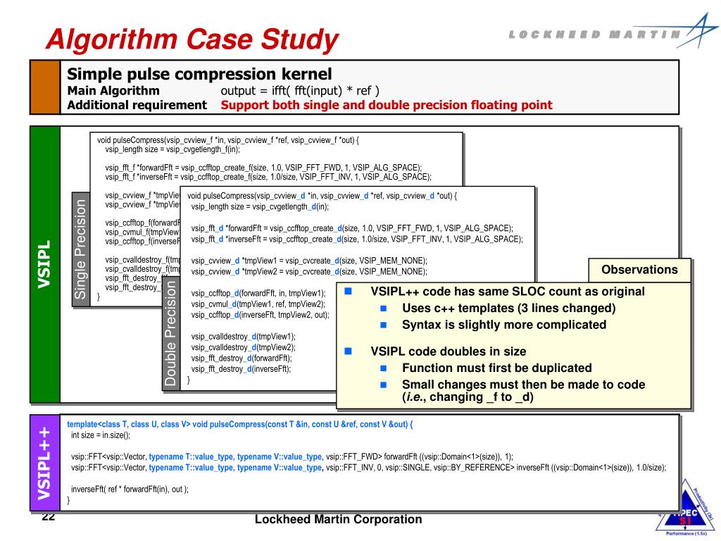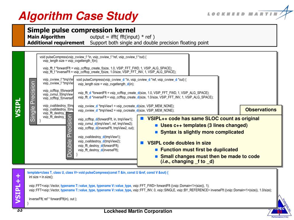 Algorithm Case Study Overview • Goal • Show how we reached some of our VSIPL++ conclusions by walking through the series of steps needed to convert a part of our application from VSIPL to VSIPL++ • Algorithm • Starting point • Simplified version of a pulse compression kernel • Math: output = ifft( fft(input) * reference) • Add requirements • Error handling • Decimate input • Support both single and double precision • Port application to embedded system