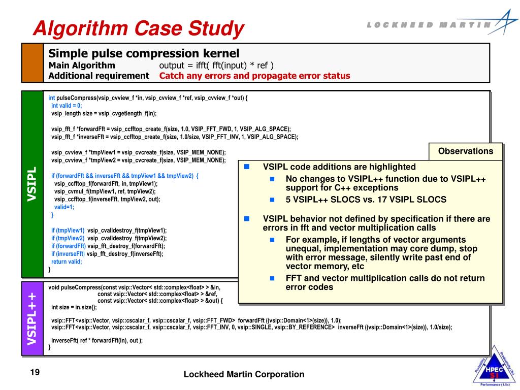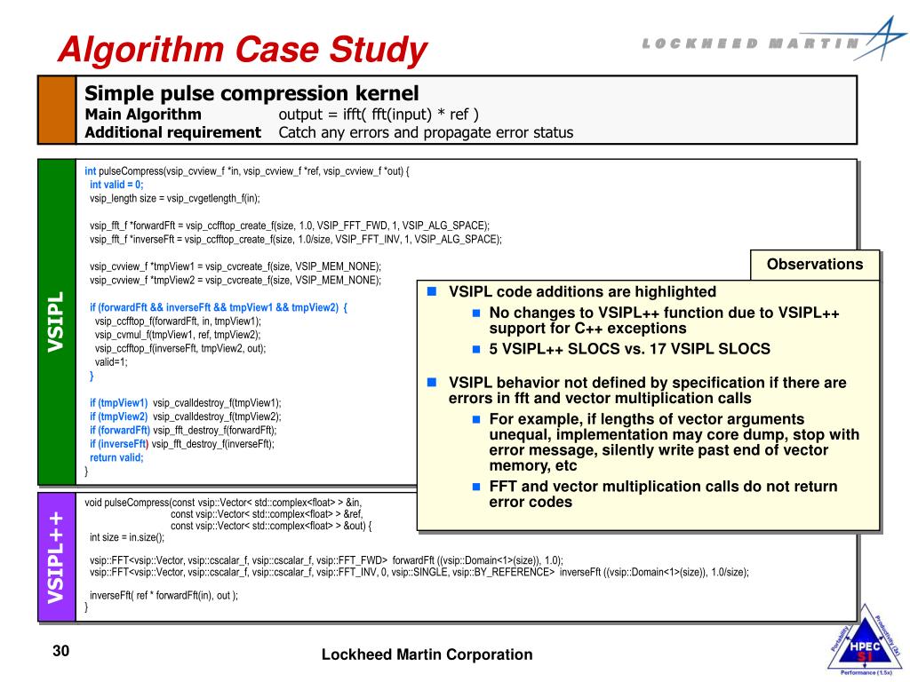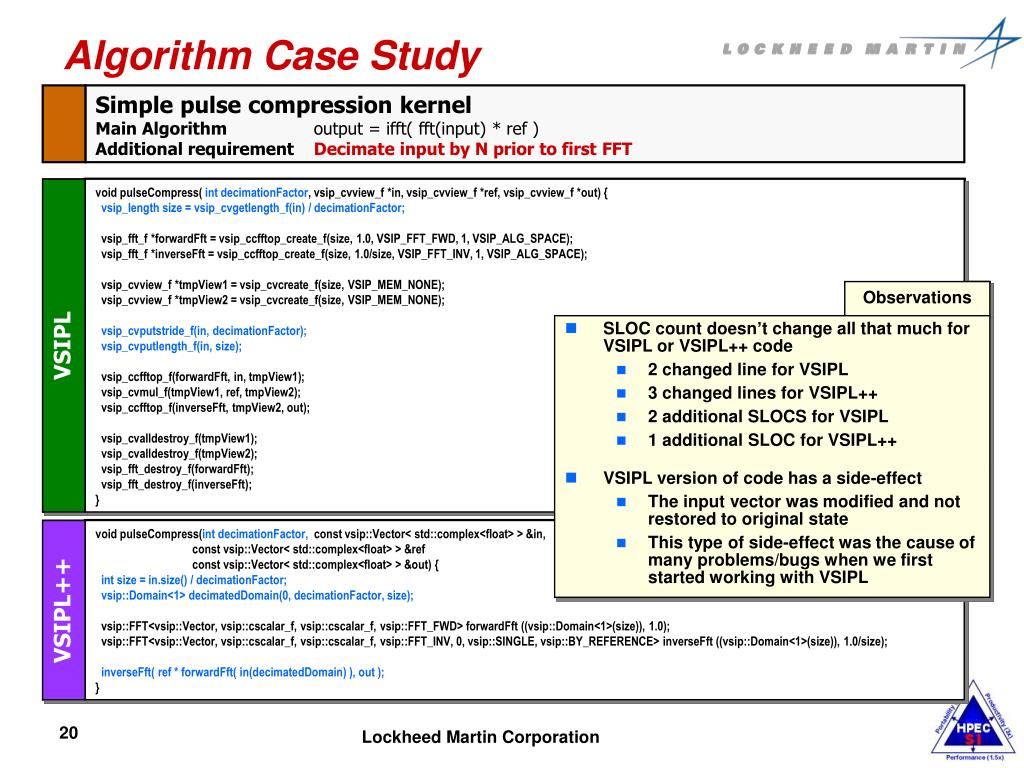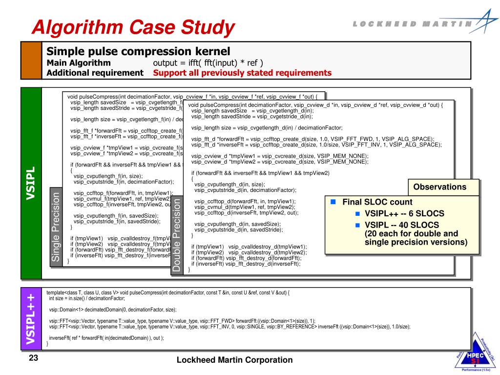 Algorithm Case Study Overview • Goal • Show how we reached some of our VSIPL++ conclusions by walking through the series of steps needed to convert a part of our application from VSIPL to VSIPL++ • Algorithm • Starting point • Simplified version of a pulse compression kernel • Math: output = ifft( fft(input) * reference) • Add requirements • Error handling • Decimate input • Support both single and double precision • Port application to embedded system
