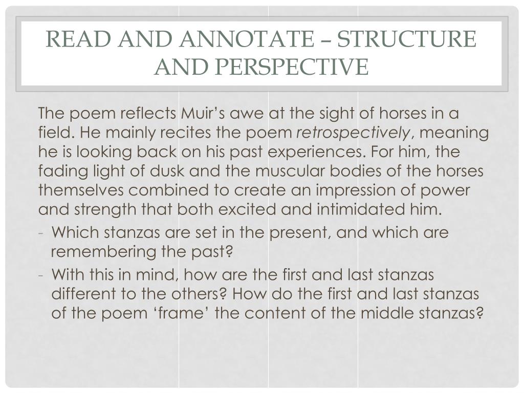Read and annotate – structure and Perspective The poem reflects Muir’s awe at the sight of horses in a field. He mainly recites the poem retrospectively, meaning he is looking back on his past experiences. For him, the fading light of dusk and the muscular bodies of the horses themselves combined to create an impression of power and strength that both excited and intimidated him. • Which stanzas are set in the present, and which are remembering the past? • With this in mind, how are the first and last stanzas different to the others? How do the first and last stanzas of the poem ‘frame’ the content of the middle stanzas?