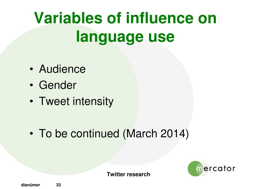 Variables of influence on languageuse • Audience • Gender • Tweetintensity • Tobecontinued (March 2014) Twitter research