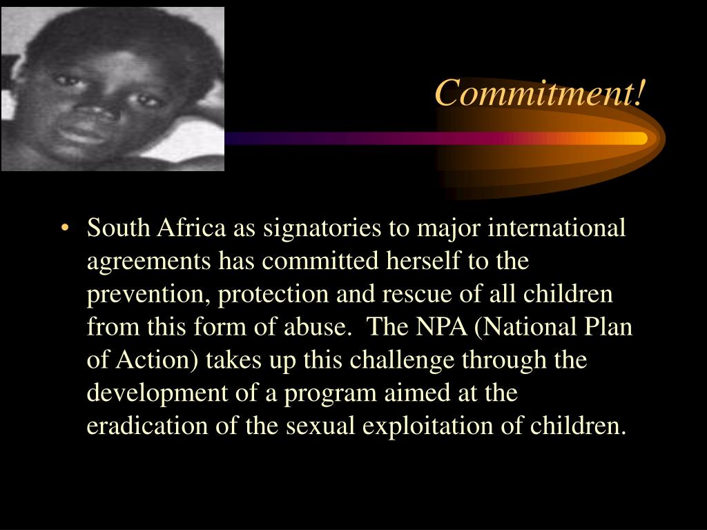 Commitment! • South Africa as signatories to major international agreements has committed herself to the prevention, protection and rescue of all children from this form of abuse. The NPA (National Plan of Action) takes up this challenge through the development of a program aimed at the eradication of the sexual exploitation of children.