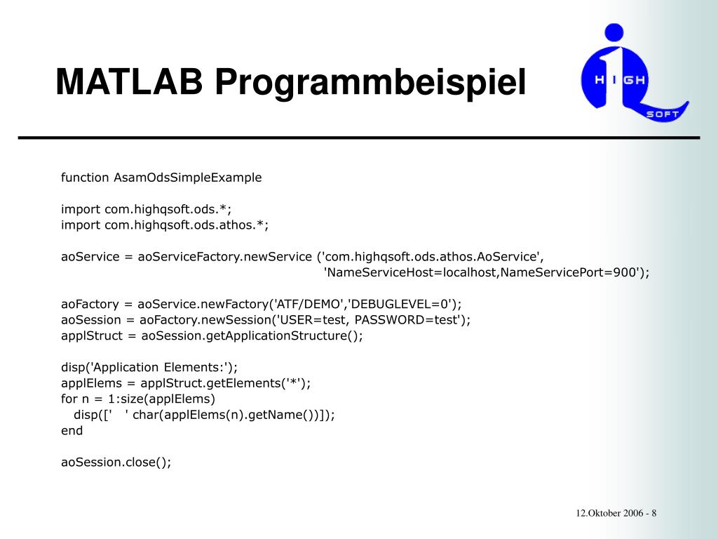 MATLAB Programmbeispiel function AsamOdsSimpleExample import com.highqsoft.ods.*; import com.highqsoft.ods.athos.*; aoService = aoServiceFactory.newService ('com.highqsoft.ods.athos.AoService', 'NameServiceHost=localhost,NameServicePort=900'); aoFactory = aoService.newFactory('ATF/DEMO','DEBUGLEVEL=0'); aoSession = aoFactory.newSession('USER=test, PASSWORD=test'); applStruct = aoSession.getApplicationStructure(); disp('Application Elements:'); applElems = applStruct.getElements('*'); for n = 1:size(applElems) disp([' ' char(applElems(n).getName())]); end aoSession.close(); 12.Oktober 2006 - 8