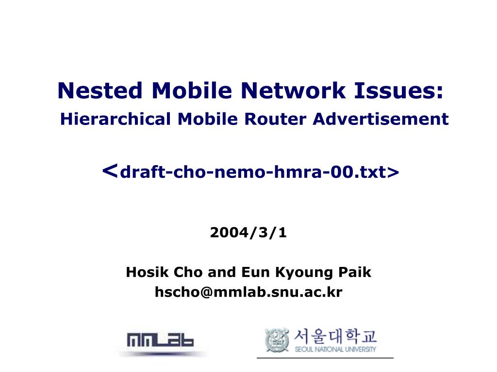 Nested Mobile Network Issues: Hierarchical Mobile Router Advertisement<draft-cho-nemo-hmra-00.txt> 2004/3/1 Hosik Cho and Eun Kyoung Paik hscho@mmlab.snu.ac.kr