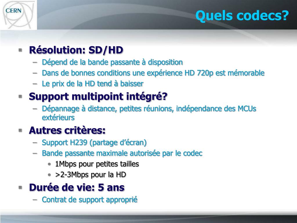 Quelscodecs? • Format: Dépendde la taille de la salle • Set-top box ou Rack-mounted • Protocoles • H323 par défaut • SIP utile pour la connexiontéléphonique (passerelle SIP/PABX) • Interface unique pour la visio et la conférencetéléphonique! • H320 (ISDN) • Au CERN plus qu’unesalle avec support ISDN • La connectiqueestprimordiale • Uneconnectiquepropriétaire rend plus difficilel’adéquation des systemesd’acquisition (audio, vidéo) à la taille de la salle • Le support des standards (XLR, DVI/HDMI) la rend plus aisée • Nombresd’entrées/sorties