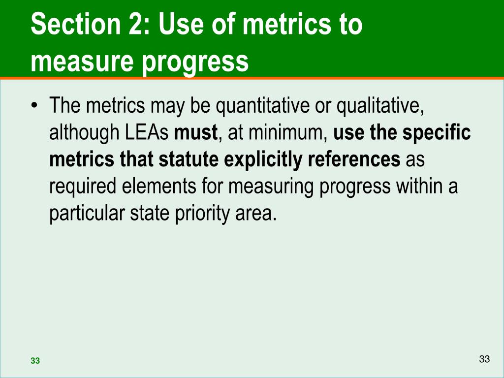 Section 2: Use of metrics to measure progress The metrics may be quantitative or qualitative, although LEAs must, at minimum, use the specific metrics that statute explicitly references as required elements for measuring progress within a particular state priority area.