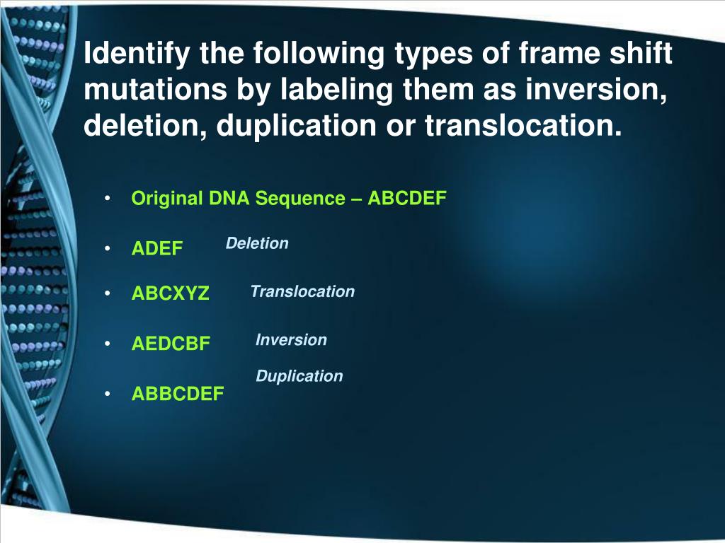 Identify the following types of frame shift mutations by labeling them as inversion, deletion, duplication or translocation. • Original DNA Sequence – ABCDEF • ADEF • ABCXYZ • AEDCBF • ABBCDEF Deletion Translocation Inversion Duplication