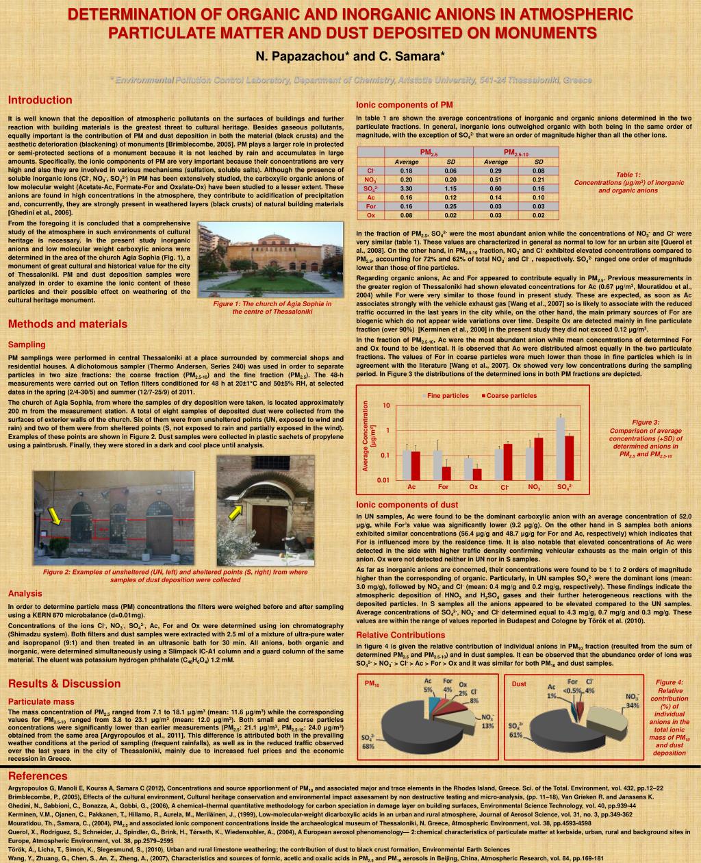 Study on inorganic and organic anions in PM and dust impacting monuments' deterioration. Key ions include NO3-, SO42-, Acetate, and Formate. Samples from Agia Sophia church, Thessaloniki.