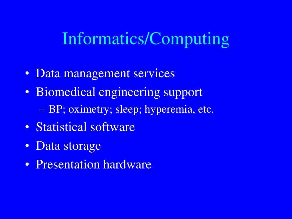 Informatics/Computing • Data management services • Biomedical engineering support • BP; oximetry; sleep; hyperemia, etc. • Statistical software • Data storage • Presentation hardware