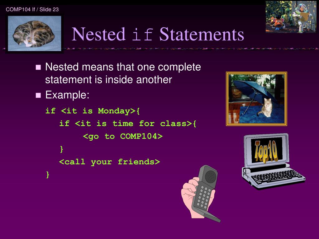 Nested if Statements • Nested means that one complete statement is inside another • Example: if <it is Monday>{ if <it is time for class>{ <go to COMP104> } <call your friends> } Top10