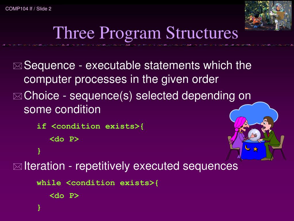 Programming. if Statements. Three Program Structures. Sequence - executable statements which the computer processes in the given order Choice - sequence(s) selected depending on some condition if <condition exists>{ <do P> } Iteration - repetitively executed sequences