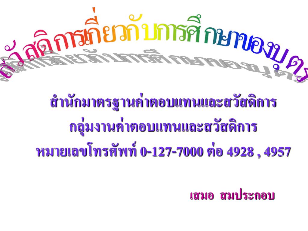 สวัสดิการเกี่ยวกับการศึกษาของบุตรสวัสดิการเกี่ยวกับการศึกษาของบุตร สำนักมาตรฐานค่าตอบแทนและสวัสดิการกลุ่มงานค่าตอบแทนและสวัสดิการหมายเลขโทรศัพท์ 0-127-7000 ต่อ 4928 , 4957 เสมอ สมประกอบ