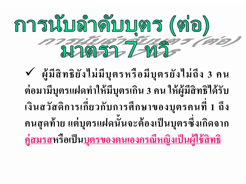 การนับลำดับบุตร (ต่อ) มาตรา 7 ทวิ • ผู้มีสิทธิยังไม่มีบุตรหรือมีบุตรยังไม่ถึง 3 คน ต่อมามีบุตรแฝดทำให้มีบุตรเกิน 3 คน ให้ผู้มีสิทธิได้รับเงินสวัสดิการเกี่ยวกับการศึกษาของบุตรคนที่ 1 ถึง คนสุดท้าย แต่บุตรแฝดนั้นจะต้องเป็นบุตรซึ่งเกิดจาก คู่สมรสหรือเป็นบุตรของตนเองกรณีหญิงเป็นผู้ใช้สิทธิ