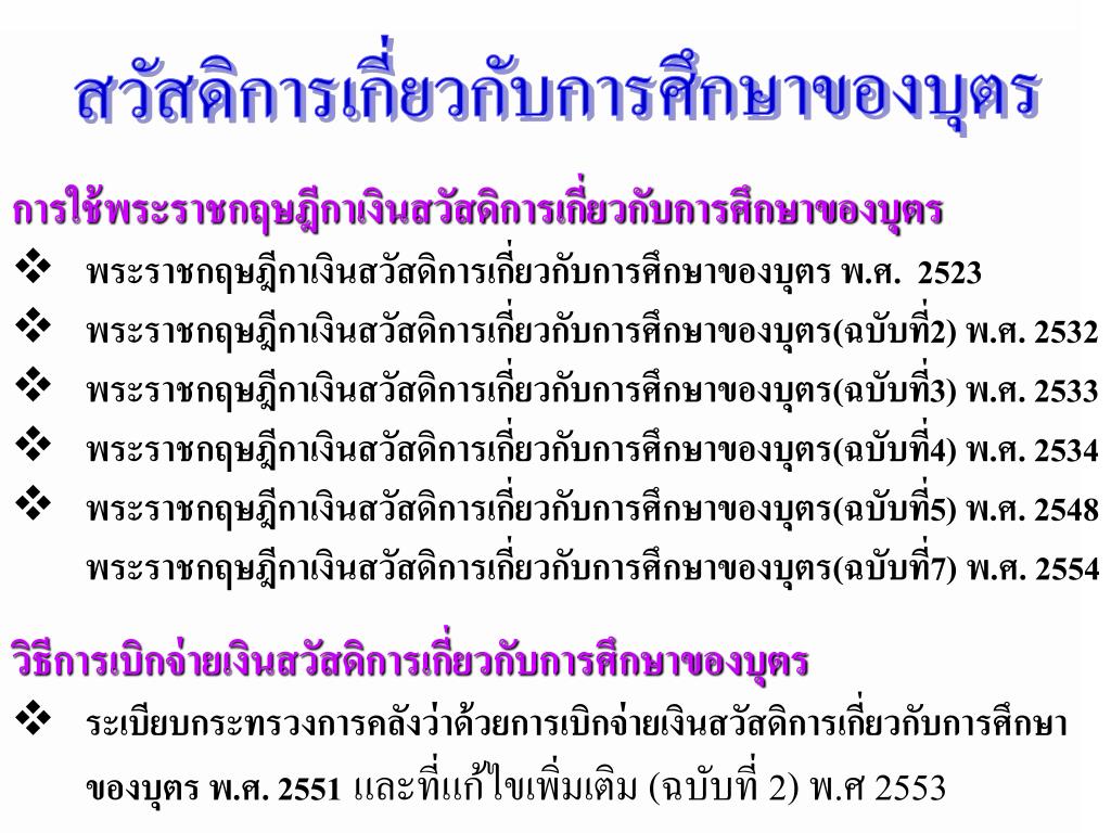 สวัสดิการเกี่ยวกับการศึกษาของบุตร. สำนักมาตรฐานค่าตอบแทนและสวัสดิการ กลุ่มงานค่าตอบแทนและสวัสดิการ หมายเลขโทรศัพท์ 0-127-7000 ต่อ 4928 , 4957. เสมอ สมประกอบ. การใช้พระราชกฤษฎีกาเงินสวัสดิการเกี่ยวกับการศึกษาของบุตร พระราชกฤษฎีกาเงินสวัสดิการเกี่ยวกับการศึกษาของบุตร พ.ศ. 2523