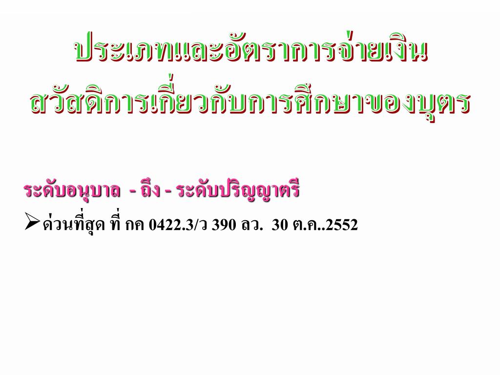 ระดับอนุบาล - ถึง - ระดับปริญญาตรี ด่วนที่สุด ที่ กค 0422.3/ว 390 ลว.30ต.ค..2552 ประเภทและอัตราการจ่ายเงิน สวัสดิการเกี่ยวกับการศึกษาของบุตร
