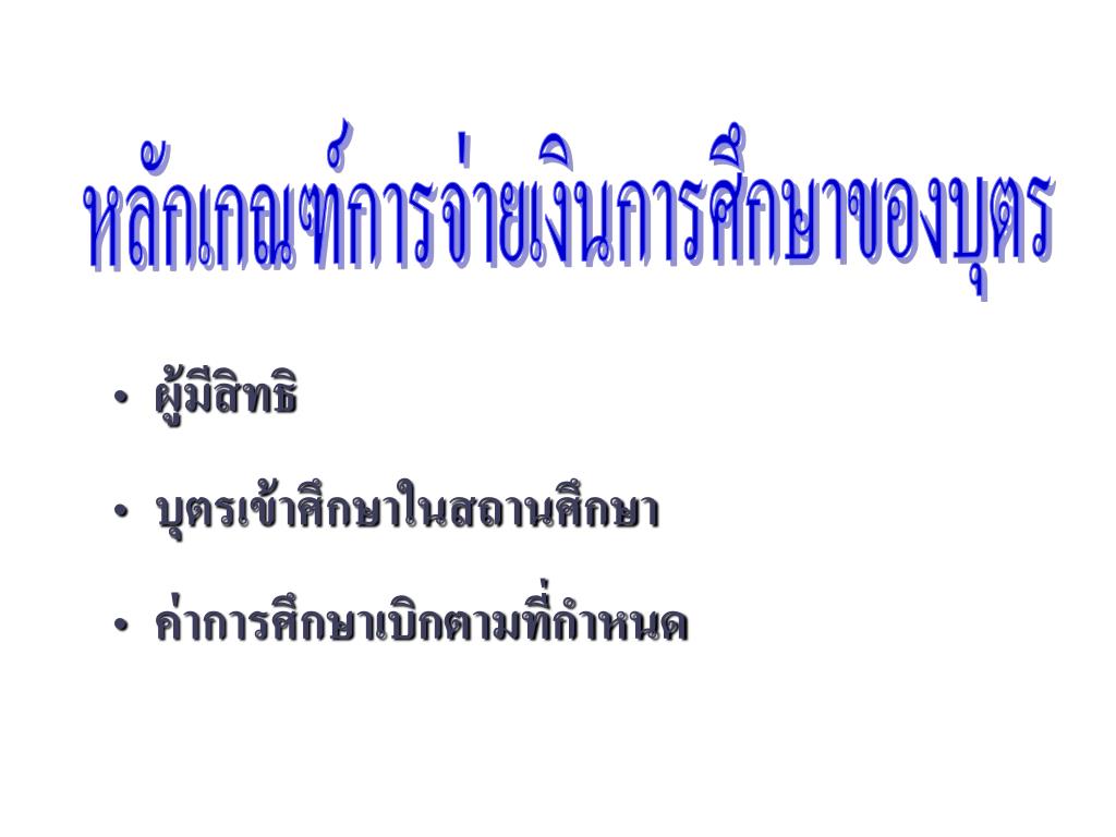 หลักเกณฑ์การจ่ายเงินการศึกษาของบุตรหลักเกณฑ์การจ่ายเงินการศึกษาของบุตร • ผู้มีสิทธิ • บุตรเข้าศึกษาในสถานศึกษา • ค่าการศึกษาเบิกตามที่กำหนด