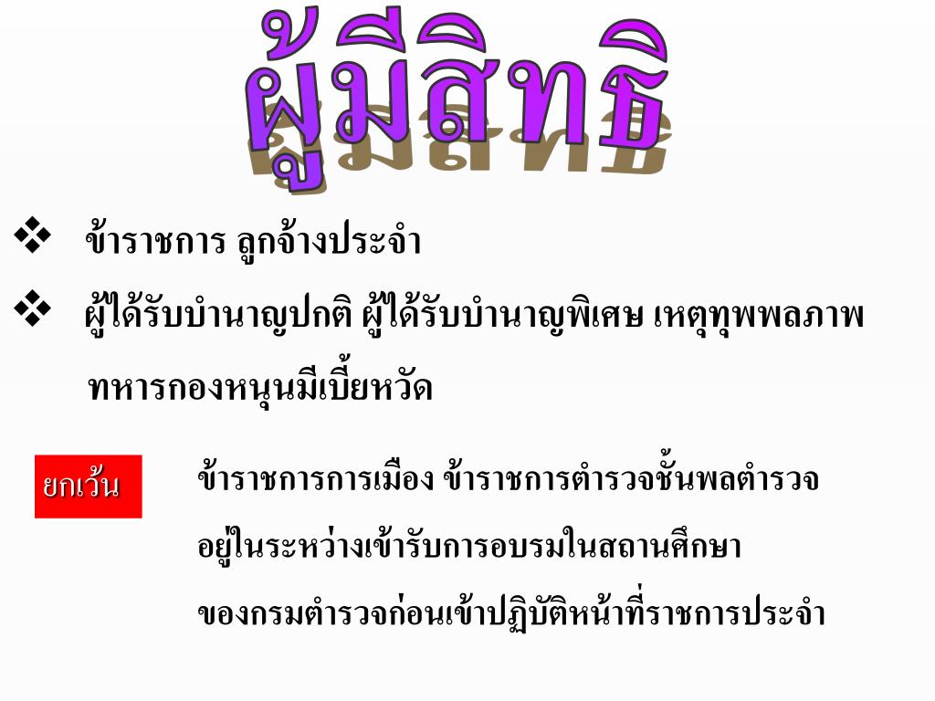 ข้าราชการ ลูกจ้างประจำ ผู้มีสิทธิ • ผู้ได้รับบำนาญปกติ ผู้ได้รับบำนาญพิเศษ เหตุทุพพลภาพ ทหารกองหนุนมีเบี้ยหวัด ข้าราชการการเมือง ข้าราชการตำรวจชั้นพลตำรวจ อยู่ในระหว่างเข้ารับการอบรมในสถานศึกษา ของกรมตำรวจก่อนเข้าปฏิบัติหน้าที่ราชการประจำ ยกเว้น