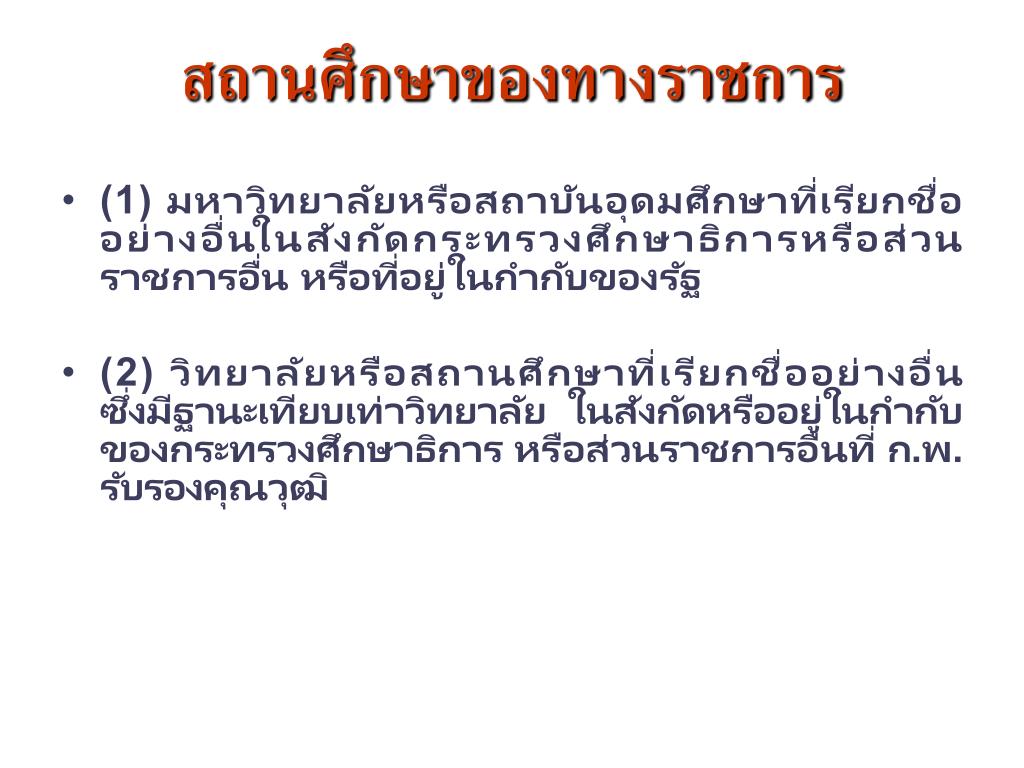 สถานศึกษาของทางราชการสถานศึกษาของทางราชการ • (1) มหาวิทยาลัยหรือสถาบันอุดมศึกษาที่เรียกชื่ออย่างอื่นในสังกัดกระทรวงศึกษาธิการหรือส่วนราชการอื่น หรือที่อยู่ในกำกับของรัฐ • (2) วิทยาลัยหรือสถานศึกษาที่เรียกชื่ออย่างอื่น ซึ่งมีฐานะเทียบเท่าวิทยาลัย ในสังกัดหรืออยู่ในกำกับของกระทรวงศึกษาธิการ หรือส่วนราชการอื่นที่ ก.พ. รับรองคุณวุฒิ