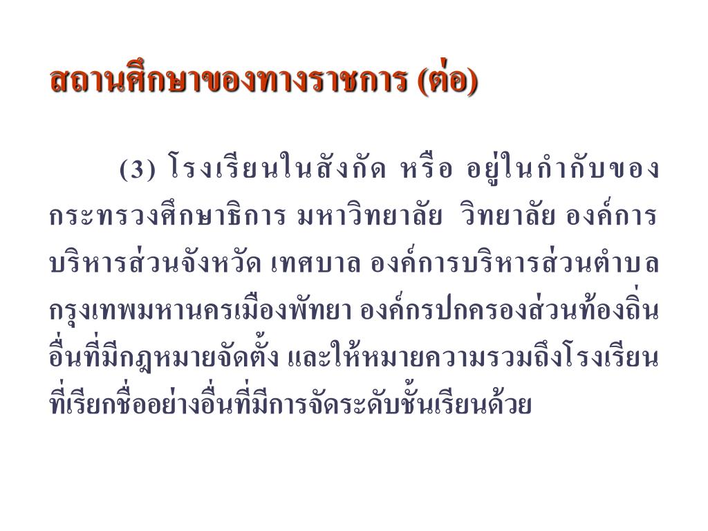 สถานศึกษาของทางราชการ (ต่อ) (3) โรงเรียนในสังกัด หรือ อยู่ในกำกับของกระทรวงศึกษาธิการ มหาวิทยาลัย วิทยาลัย องค์การบริหารส่วนจังหวัด เทศบาล องค์การบริหารส่วนตำบล กรุงเทพมหานครเมืองพัทยา องค์กรปกครองส่วนท้องถิ่นอื่นที่มีกฎหมายจัดตั้ง และให้หมายความรวมถึงโรงเรียน ที่เรียกชื่ออย่างอื่นที่มีการจัดระดับชั้นเรียนด้วย