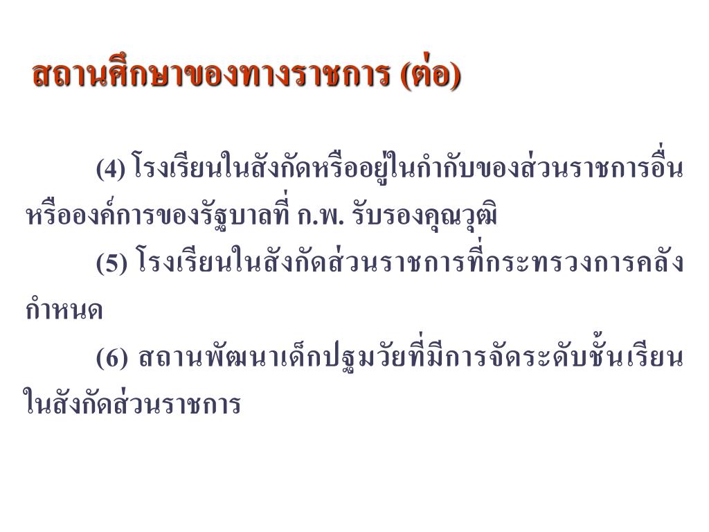 สถานศึกษาของทางราชการ (ต่อ) (4) โรงเรียนในสังกัดหรืออยู่ในกำกับของส่วนราชการอื่น หรือองค์การของรัฐบาลที่ ก.พ. รับรองคุณวุฒิ (5) โรงเรียนในสังกัดส่วนราชการที่กระทรวงการคลังกำหนด (6) สถานพัฒนาเด็กปฐมวัยที่มีการจัดระดับชั้นเรียน ในสังกัดส่วนราชการ