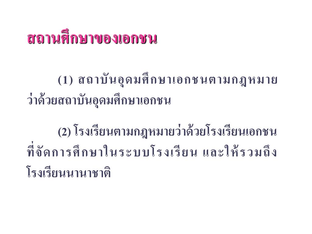 สถานศึกษาเอกชน • ค่าธรรมเนียมการศึกษา (ไม่รับการอุดหนุน) • ค่าธรรมเนียมการศึกษา (รับการอุดหนุน) ตัวอย่างระดับการประถมศึกษา ค่าธรรมเนียมการศึกษา(ไม่รับ) ปีละไม่เกิน 10,856 บาท ค่าธรรมเนียมการศึกษา(รับ) ปีละไม่เกิน 3,460 บาท รัฐอุดหนุนให้โรงเรียน คนต่อปี 7,086 บาท