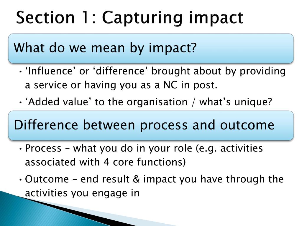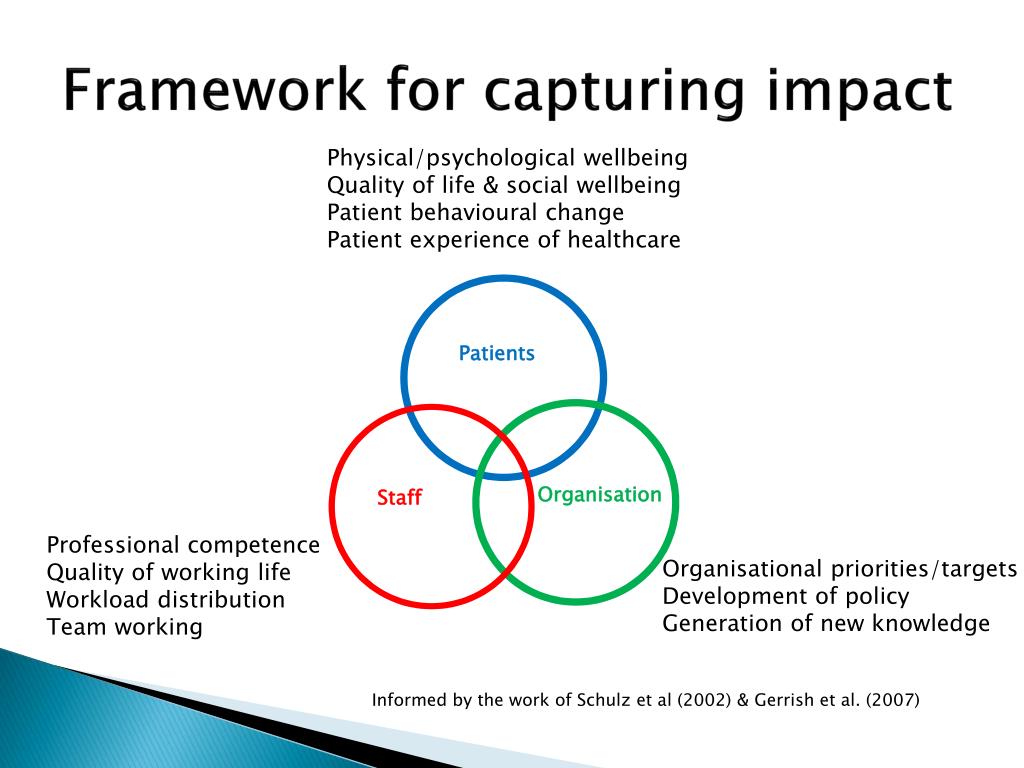Physical/psychological wellbeing Quality of life & social wellbeing Patient behavioural change Patient experience of healthcare Patients Organisation Staff Professional competence Quality of working life Workload distribution Team working Organisationalpriorities/targets Development of policy Generation of new knowledge Framework for capturing impact Informed by the work of Schulz et al (2002) & Gerrish et al. (2007)
