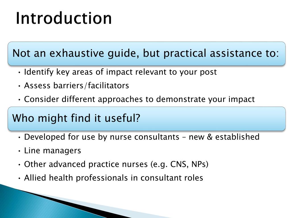 What is the evidence of impact? Kennedy Fet al (2012). Evaluation of the impact of nurse consultant roles in the United Kingdom: a mixed method systematic literature review. Journal of Advanced Nursing. 68:4 721-42