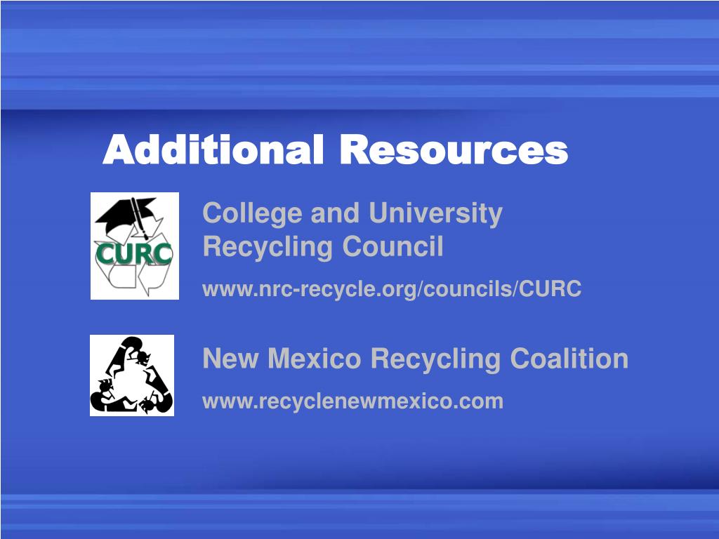 Additional Resources College and University Recycling Council www.nrc-recycle.org/councils/CURC New Mexico Recycling Coalition www.recyclenewmexico.com