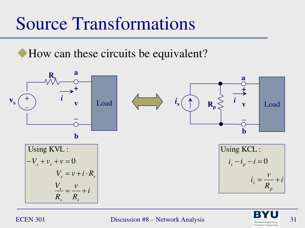Rs a a + – Rp vs is b b Source Transformations Source transformation: a procedure for transforming one source into another while retaining the terminal characteristics of the original source Node analysis is easier with current sources – mesh analysis is easier with voltage sources. Discussion #8 – Network Analysis
