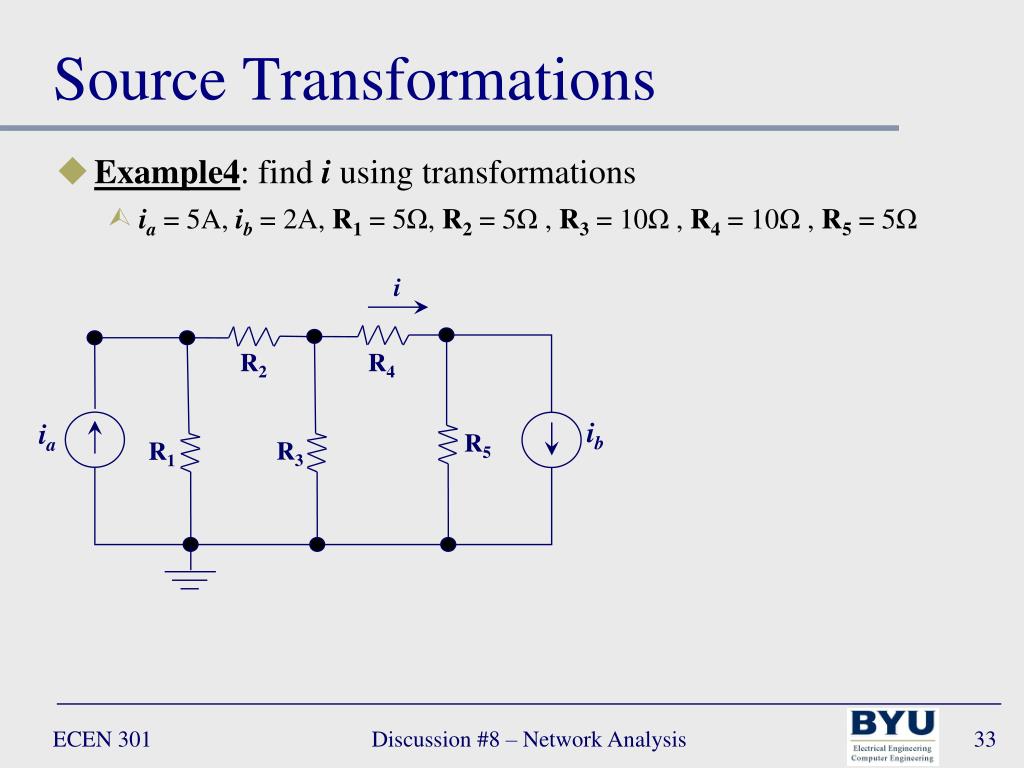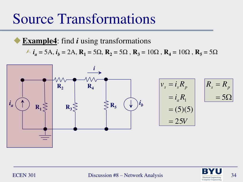ib Source Transformations • Example4: find i using transformations • ia= 5A, ib= 2A, R1= 5Ω, R2= 5Ω , R3 = 10Ω , R4 = 10Ω , R5 = 5Ω i R4 R5 Rp R3 is Discussion #8 – Network Analysis