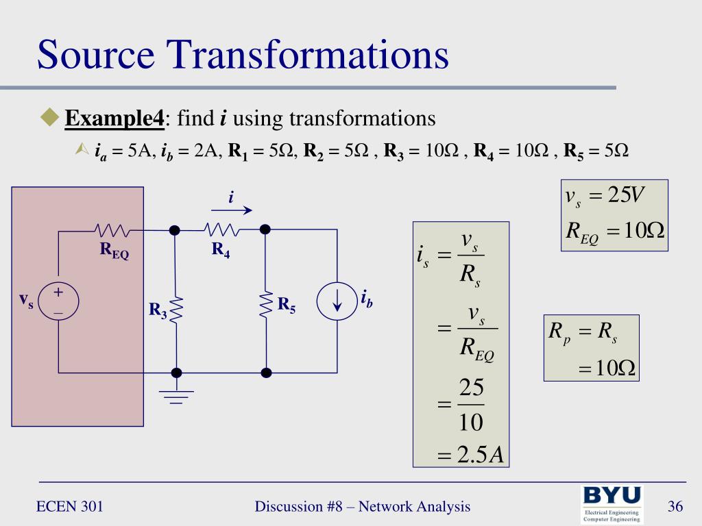vs2 vs + – – + Source Transformations • Example4: find i using transformations • ia= 5A, ib= 2A, R1= 5Ω, R2= 5Ω , R3 = 10Ω , R4 = 10Ω , R5 = 5Ω i REQ2 Discussion #8 – Network Analysis