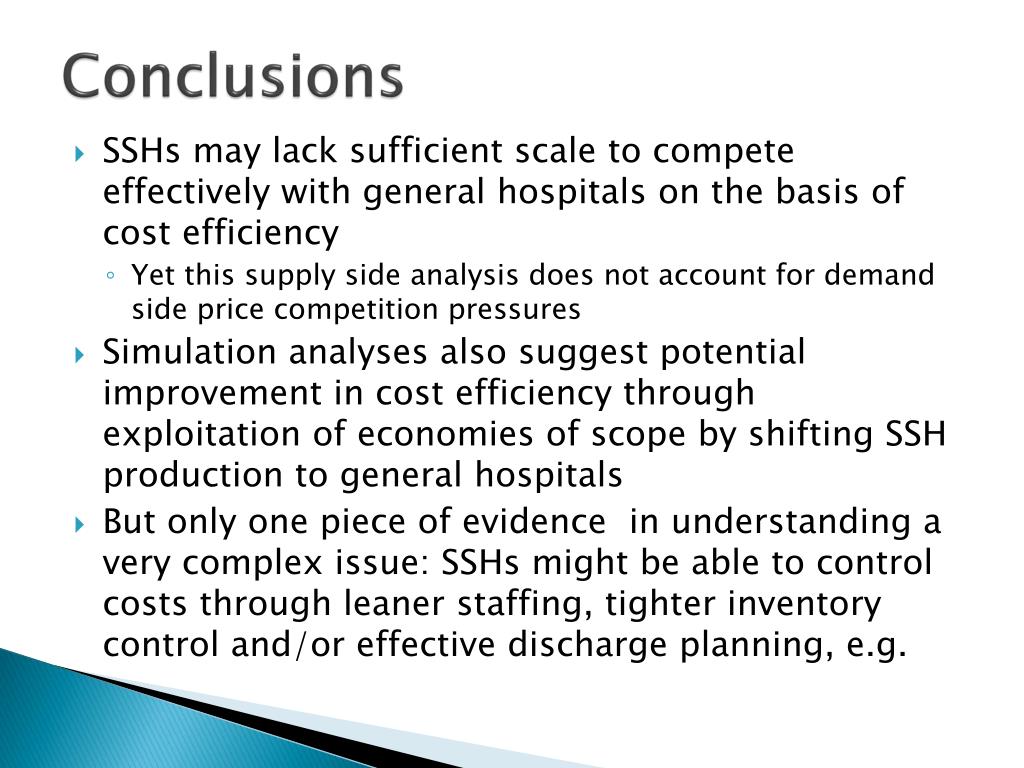 Conclusions • SSHs may lack sufficient scale to compete effectively with general hospitals on the basis of cost efficiency • Yet this supply side analysis does not account for demand side price competition pressures • Simulation analyses also suggest potential improvement in cost efficiency through exploitation of economies of scope by shifting SSH production to general hospitals • But only one piece of evidence in understanding a very complex issue: SSHs might be able to control costs through leaner staffing, tighter inventory control and/or effective discharge planning, e.g.