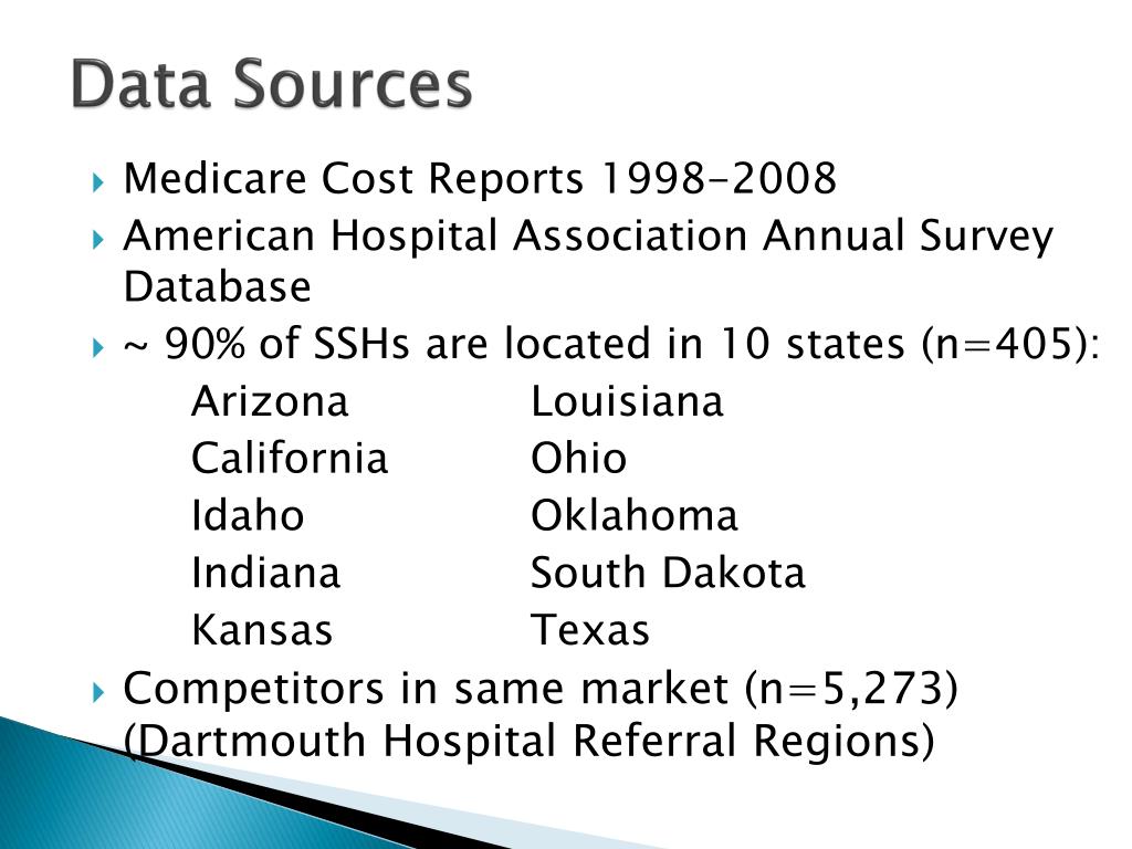 Data Sources • Medicare Cost Reports 1998-2008 • American Hospital Association Annual Survey Database • ~ 90% of SSHs are located in 10 states (n=405): Arizona Louisiana California Ohio Idaho Oklahoma Indiana South Dakota Kansas Texas • Competitorsin same market (n=5,273) (Dartmouth Hospital Referral Regions)