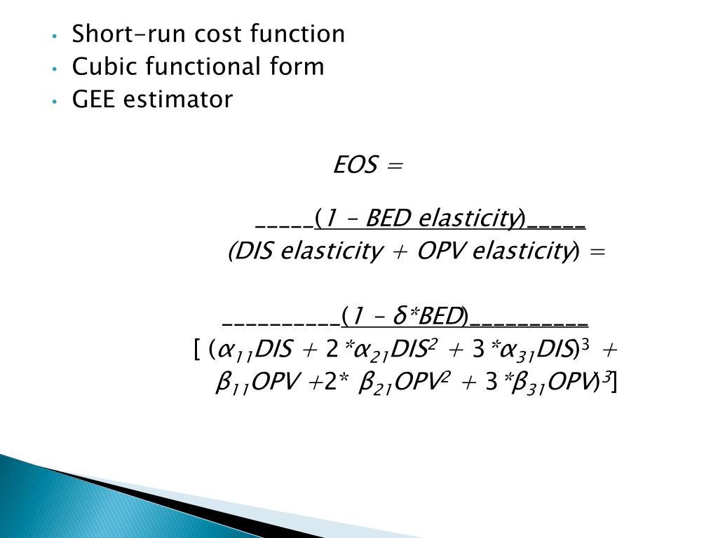 Short-run cost function • Cubic functional form • GEE estimator EOS = _____(1 – BED elasticity)_____ (DIS elasticity + OPV elasticity) = __________(1 – δ*BED)__________ [(α11DIS + 2*α21DIS2 + 3*α31DIS)3 + β11OPV +2* β21OPV2 + 3*β31OPV)3]