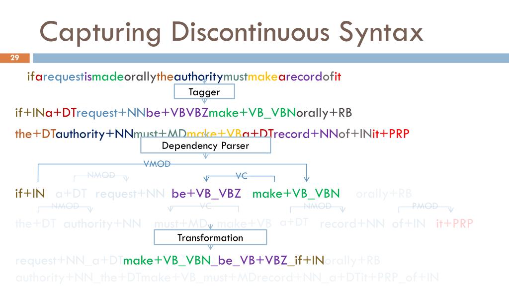 Capturing Discontinuous Syntax ifarequestismadeorallytheauthoritymustmakearecordofit if+INa+DTrequest+NNbe+VBVBZmake+VB_VBNorally+RB the+DTauthority+NNmust+MDmake+VBa+DTrecord+NNof+INit+PRP Tagger VMOD NMOD VC if+IN • a+DT request+NN be+VB_VBZ make+VB_VBN orally+RB Dependency Parser Transformation NMOD VC NMOD PMOD the+DT authority+NN must+MD make+VB a+DT record+NN of+IN it+PRP • request+NN_a+DTmake+VB_VBN_be_VB+VBZ_if+INorally+RB • authority+NN_the+DTmake+VB_must+MDrecord+NN_a+DTit+PRP_of+IN