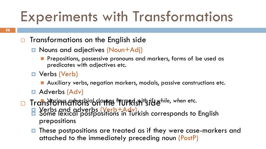 Experiments with Transformations • Transformations on the English side • Nouns and adjectives (Noun+Adj) • Prepositions, possessive pronouns and markers, forms of be used as predicates with adjectives etc. • Verbs (Verb) • Auxiliary verbs, negation markers, modals, passive constructions etc. • Adverbs (Adv) • Various adverbial clauses formed with if, while, when etc. • Verbs and adverbs (Verb+Adv) • Transformations on the Turkish side • Some lexical postpositions in Turkish corresponds to English prepositions • These postpositions are treated as if they were case-markers and attached to the immediately preceding noun (PostP)