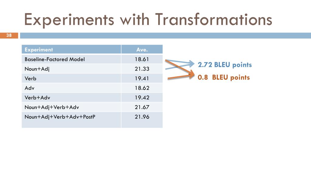 Experiments with Transformations 2.72 BLEU points 0.8 BLEU points