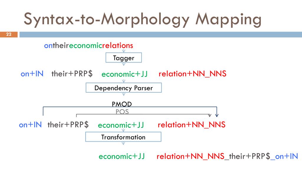 Syntax-to-Morphology Mapping ontheireconomicrelations Tagger on+IN their+PRP$ relation+NN_NNS economic+JJ Dependency Parser Transformation PMOD POS on+IN their+PRP$ relation+NN_NNS economic+JJ • relation+NN_NNS_their+PRP$_on+IN • economic+JJ