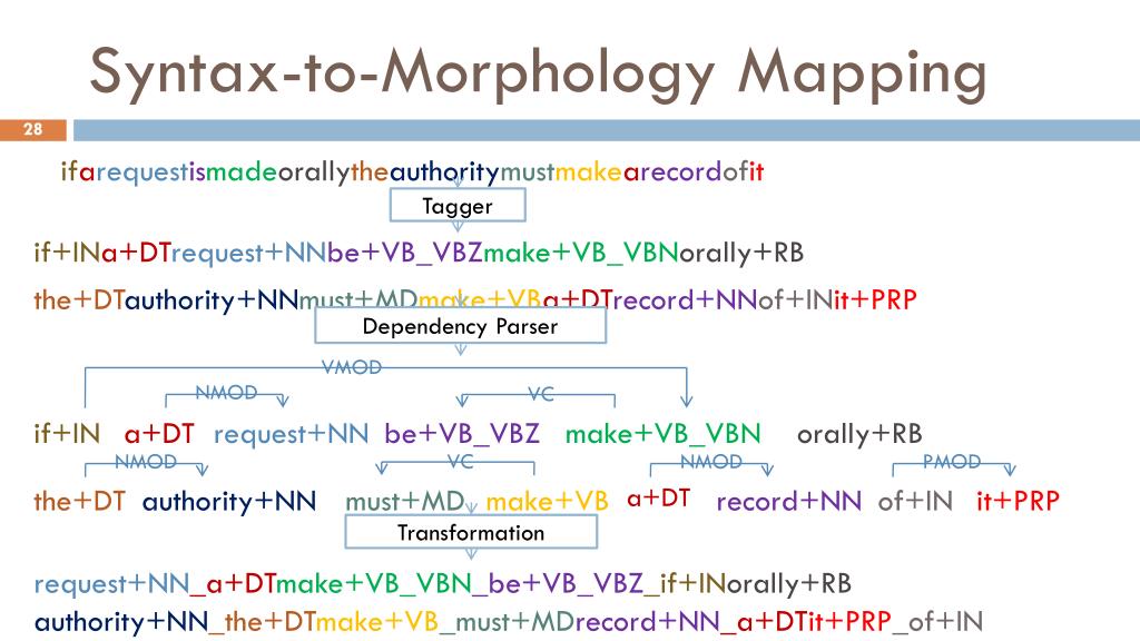 Syntax-to-Morphology Mapping ifarequestismadeorallytheauthoritymustmakearecordofit if+INa+DTrequest+NNbe+VB_VBZmake+VB_VBNorally+RB the+DTauthority+NNmust+MDmake+VBa+DTrecord+NNof+INit+PRP Tagger VMOD NMOD VC if+IN • a+DT request+NN be+VB_VBZ make+VB_VBN orally+RB Dependency Parser Transformation NMOD VC NMOD PMOD the+DT authority+NN must+MD make+VB a+DT record+NN of+IN it+PRP • request+NN_a+DTmake+VB_VBN_be+VB_VBZ_if+INorally+RB • authority+NN_the+DTmake+VB_must+MDrecord+NN_a+DTit+PRP_of+IN